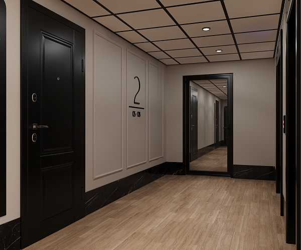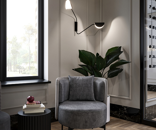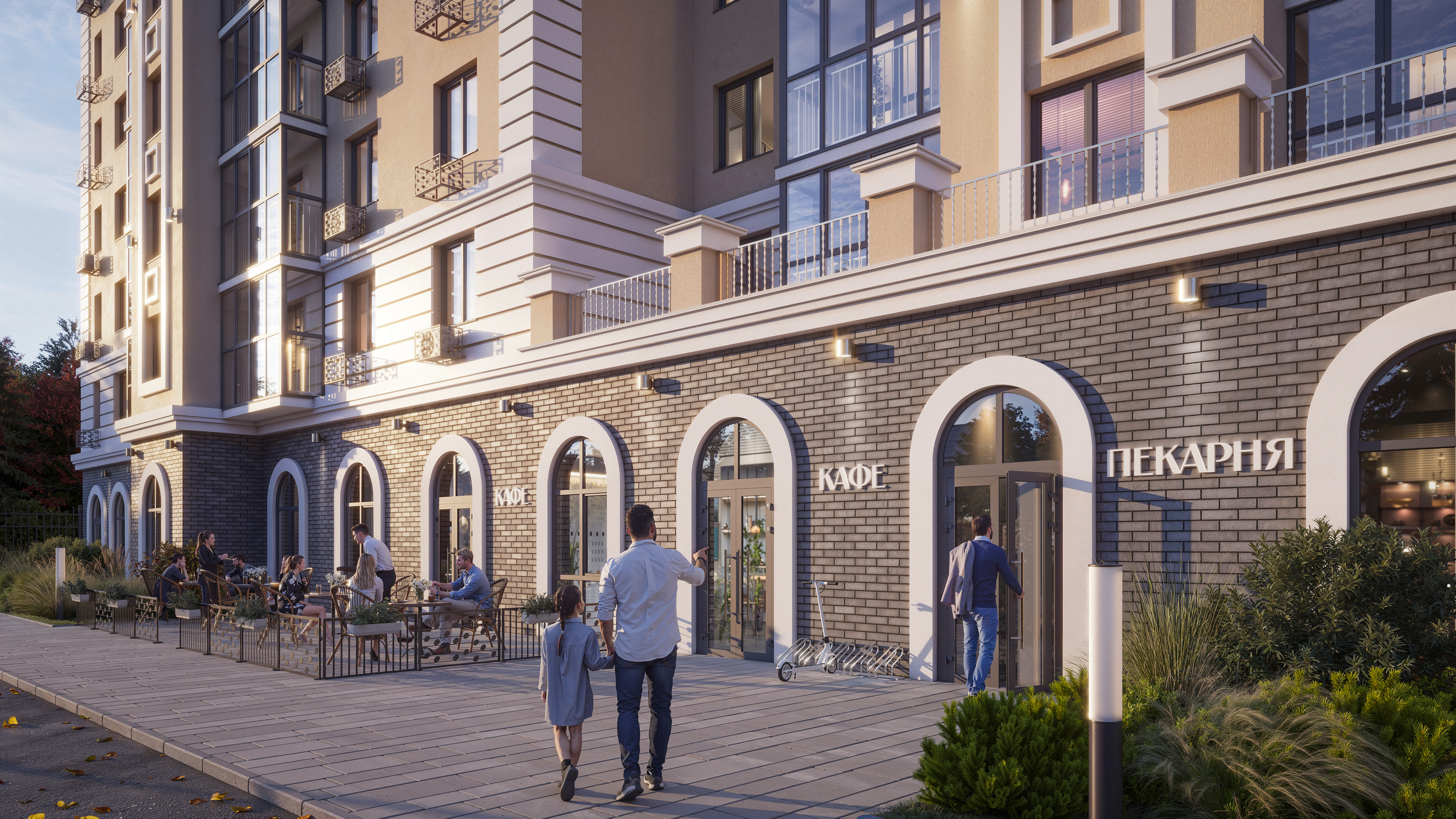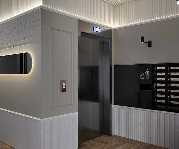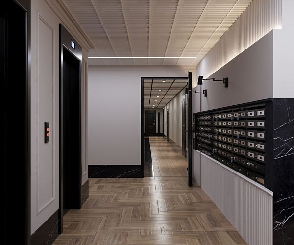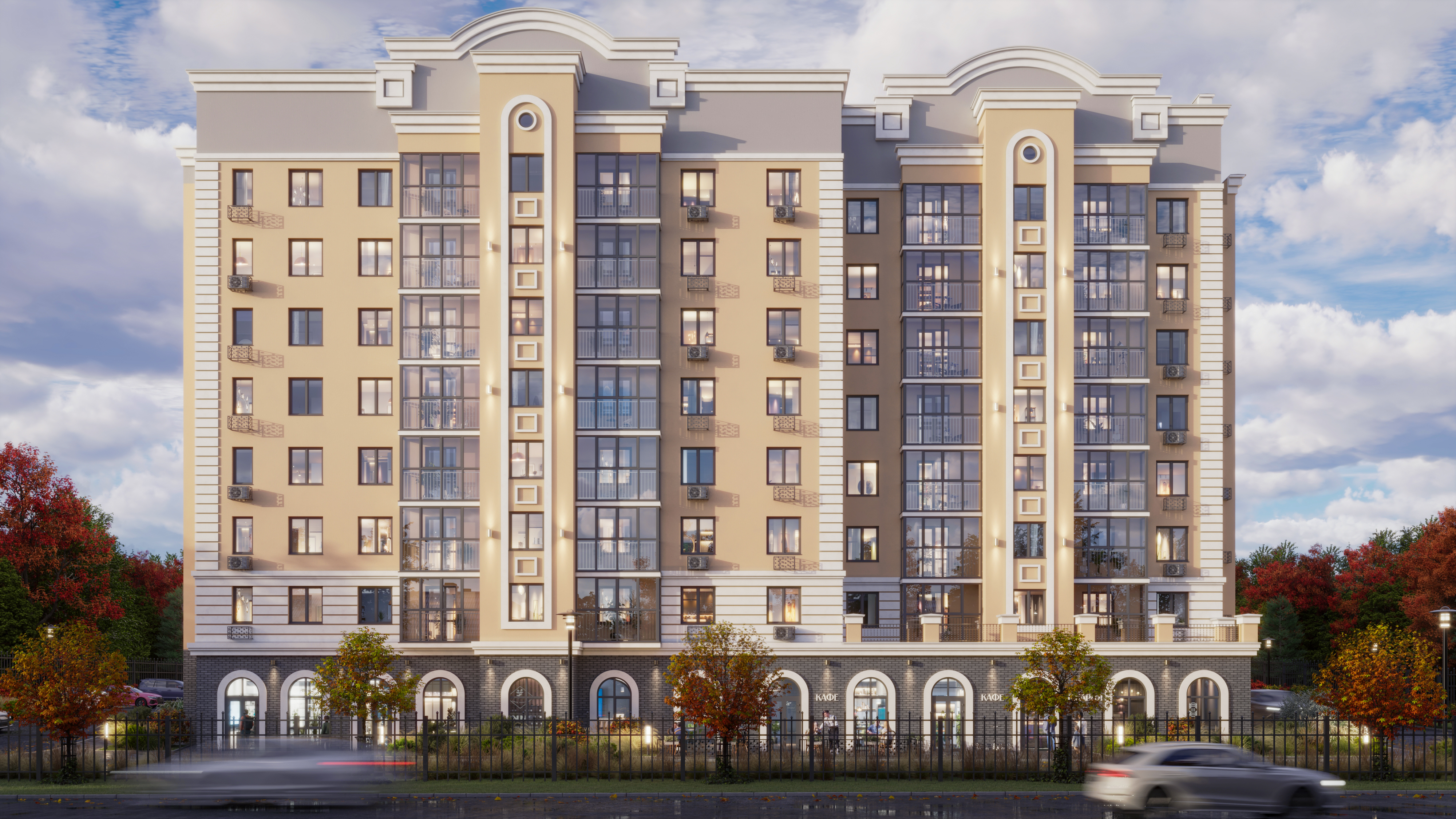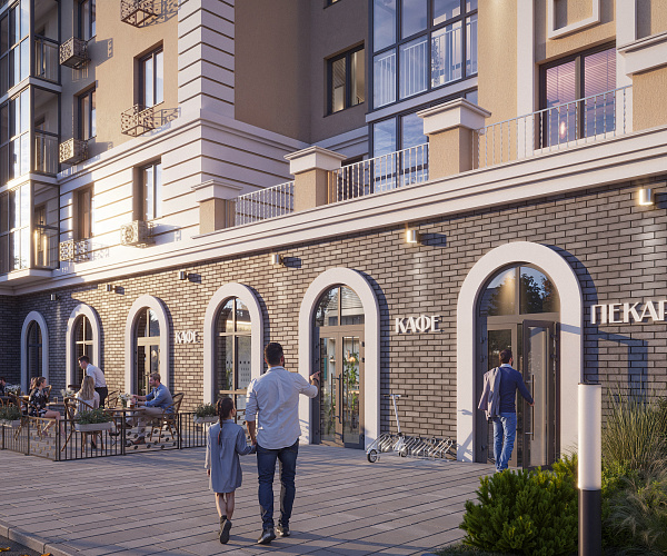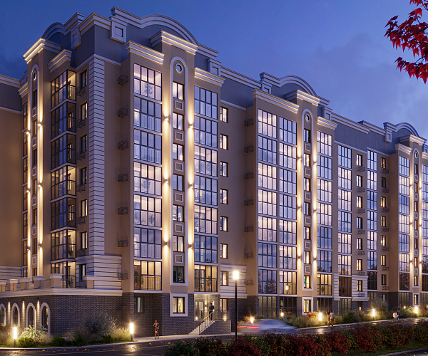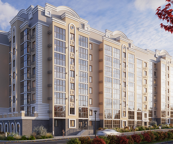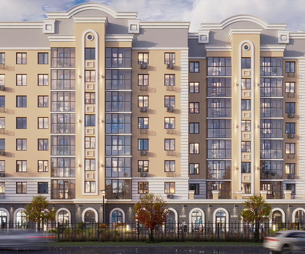 Фасад здания оформлен в стиле неоклассицизма с четкими линиями, изящными декоративными деталями и спокойными природными оттенками.