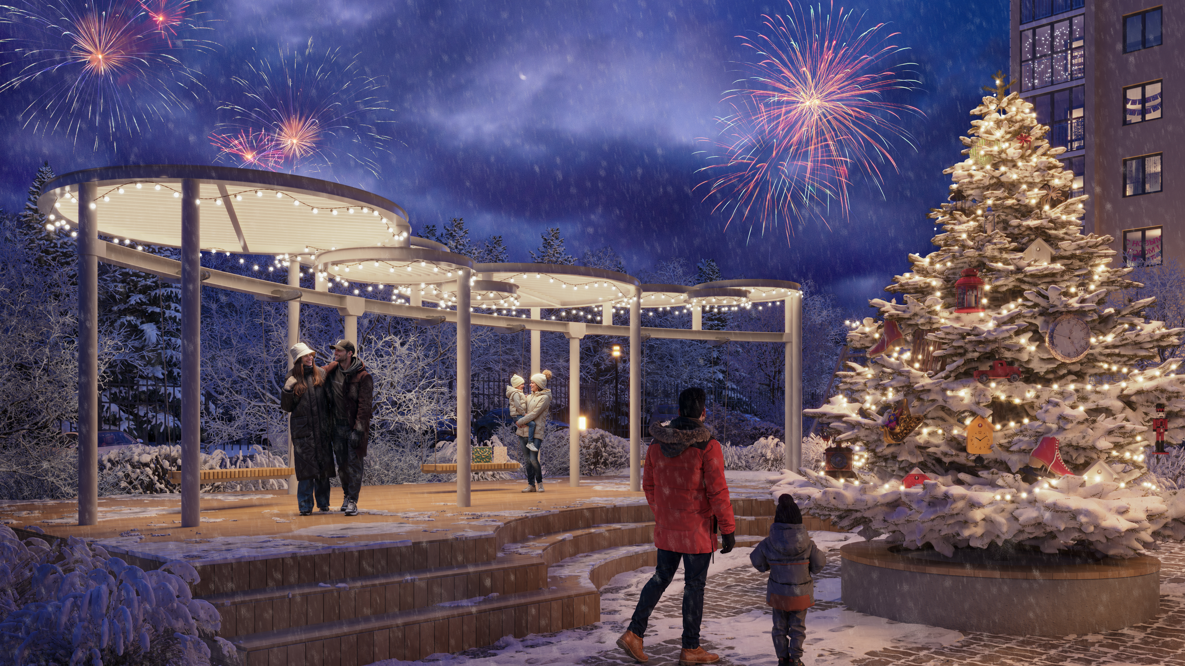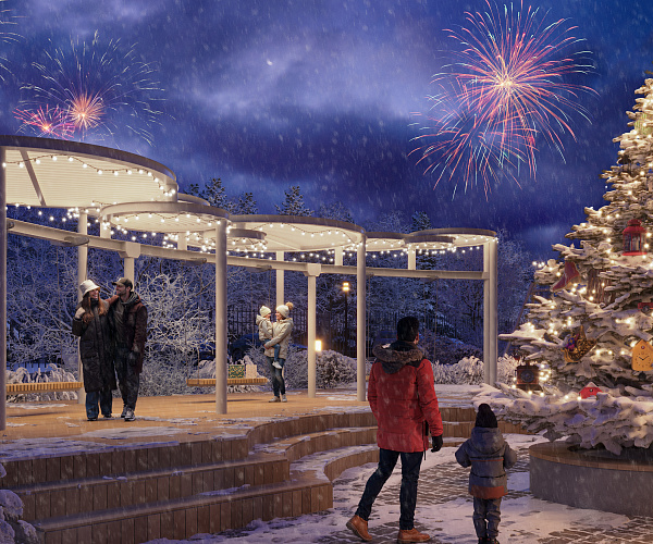 - Центр двора — большая ель, которая зимой станет центром притяжения жителей